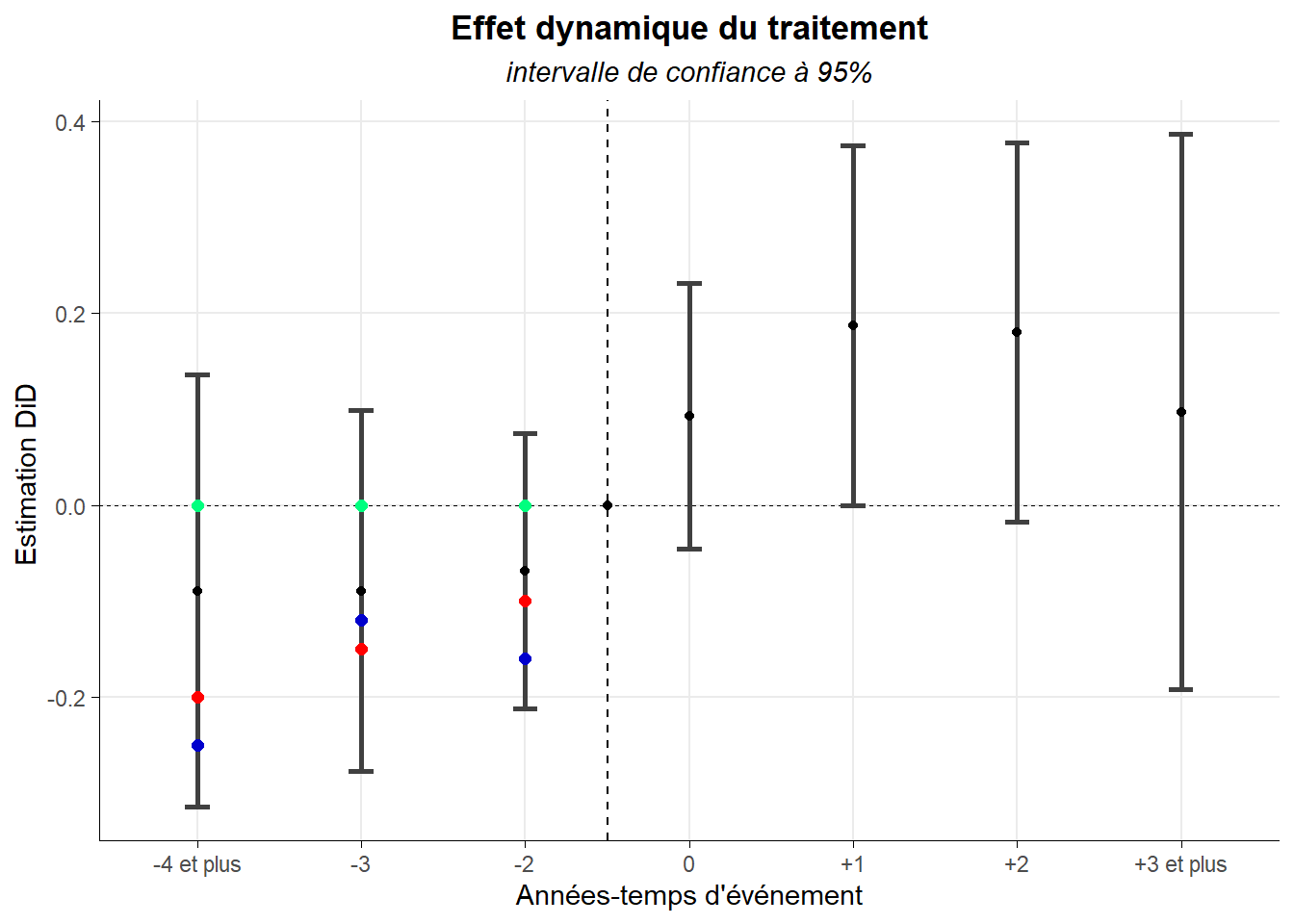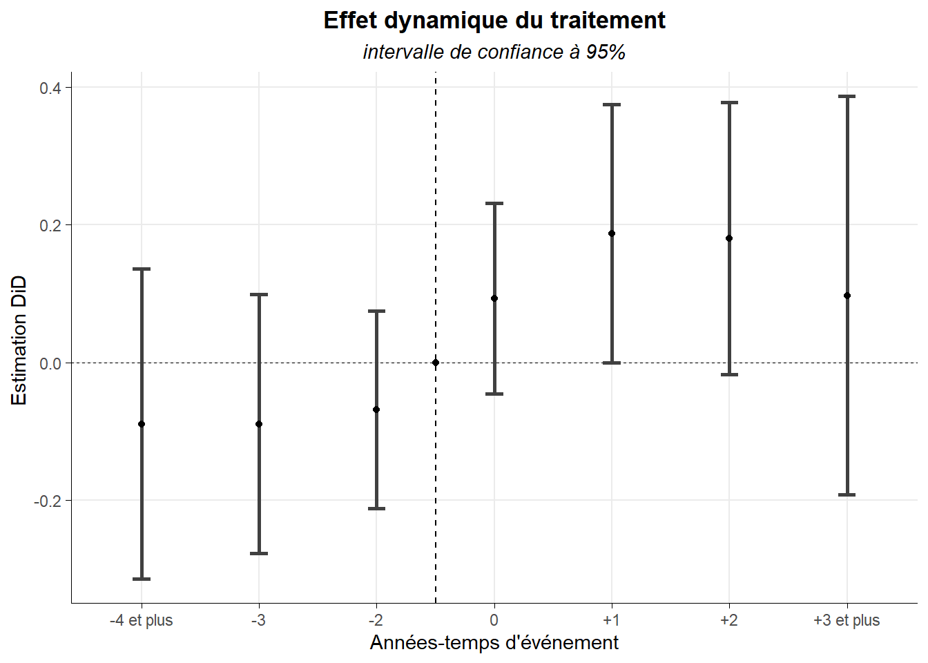 C’est à partir de Mbar fixé à 2, autrement-dit d’un niveau de violation de la parallel trend appliquée sur la période post-traitement correspondant à deux fois celui prévalant sur la période pré-traitement, que l’effet du traitement devient statistiquement non significatif (avec un intervalle de confiance établie entre -0,03 et 0,41 et donc incluant zéro).