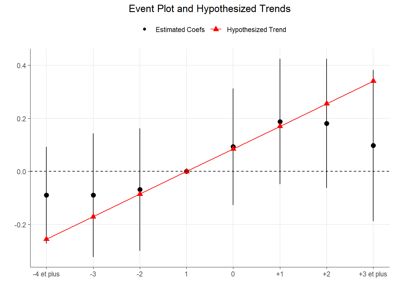 On postule que l’impact du choc n’est potentiellement pas suffisant pour expliquer l’augmentation des différences entre les groupes post-traitement. Aussi, si l’on prolonge la tendance issue des données pré-traitement, on pourrait constater la persistance d’un décalage allant dans le sens d’un effet spécifique au traitement. Néanmoins, il n’est pas nécessairement raisonnable d’imposer à l’effet du choc non contrôlé par la diff-in-diff une tendance lisse. La technique consiste alors établir l’effet du traitement pour différent niveau de violation de la parallel trend. Il s’agira alors d’identifier le niveau conduisant à rendre l’effet du traitement non significatif.