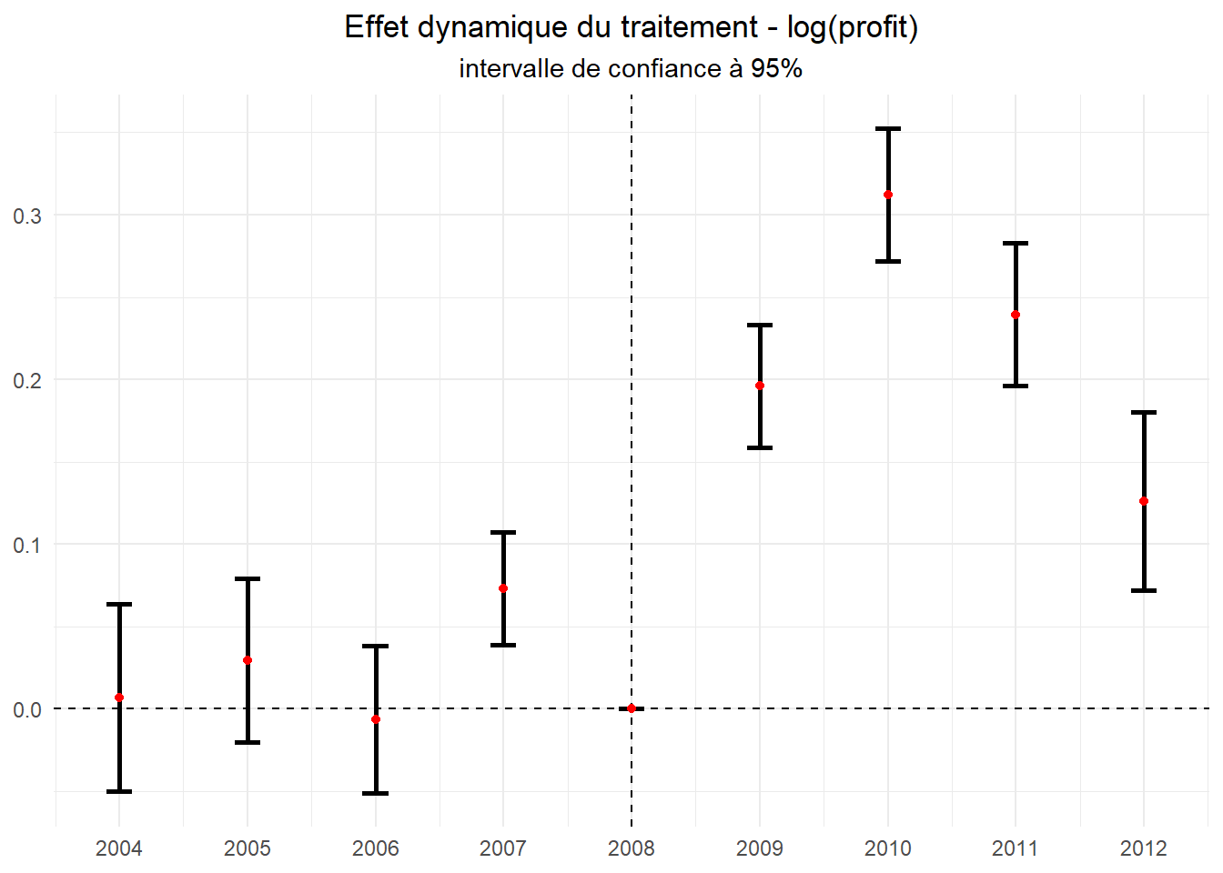 On voit clairement que l’hypothèse de coefficients tous égaux à zéro sur la période pré-traitement ne peut être retenue. L’intervalle de confiance produit pour 2007 ne comprend pas la valeur zéro. Cela conduit selon la logique des tests classiques à rejeter l’hypothèse de parallel trend et donc à remettre en cause le résultat de l’analyse diff-in-diff. La difficulté ici est qu’il puisse y avoir un choc macro-économique, ou simplement sectoriel, non observé (non pris en compte dans l’estimation) qui affecterait les restaurants de manière différente des autres entreprises de service même en l’absence de changement dans le taux de TVA. Cela rend l’identification de l’effet spécifique de ce changement impossible.