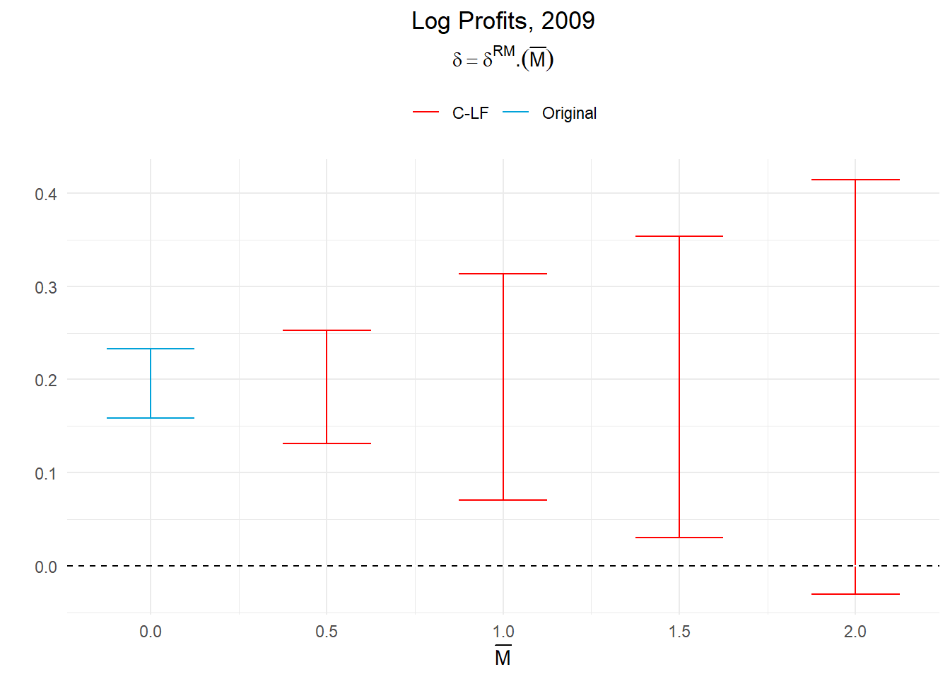 Voyons comment ces résultats s’interprètent. Commençons par le plus simple, le cas où Mbar est fixé à 1. Cette valeur signifie que nous avons restreint le niveau de violations de la parallel trend sur la période post-traitement examinée à celle prévalant sur la période pré-traitement. Pour ce niveau de distorsion, l’effet du traitement (en 2009) peut être évalué entre 0,07 et 0,31 (à 95%). Il reste ainsi statistiquement significatif. Même si l’intervalle de confiance est plus large que celui produit sous l’hypothèse de parallel trend, celui-ci n’inclut pas la valeur 0.
