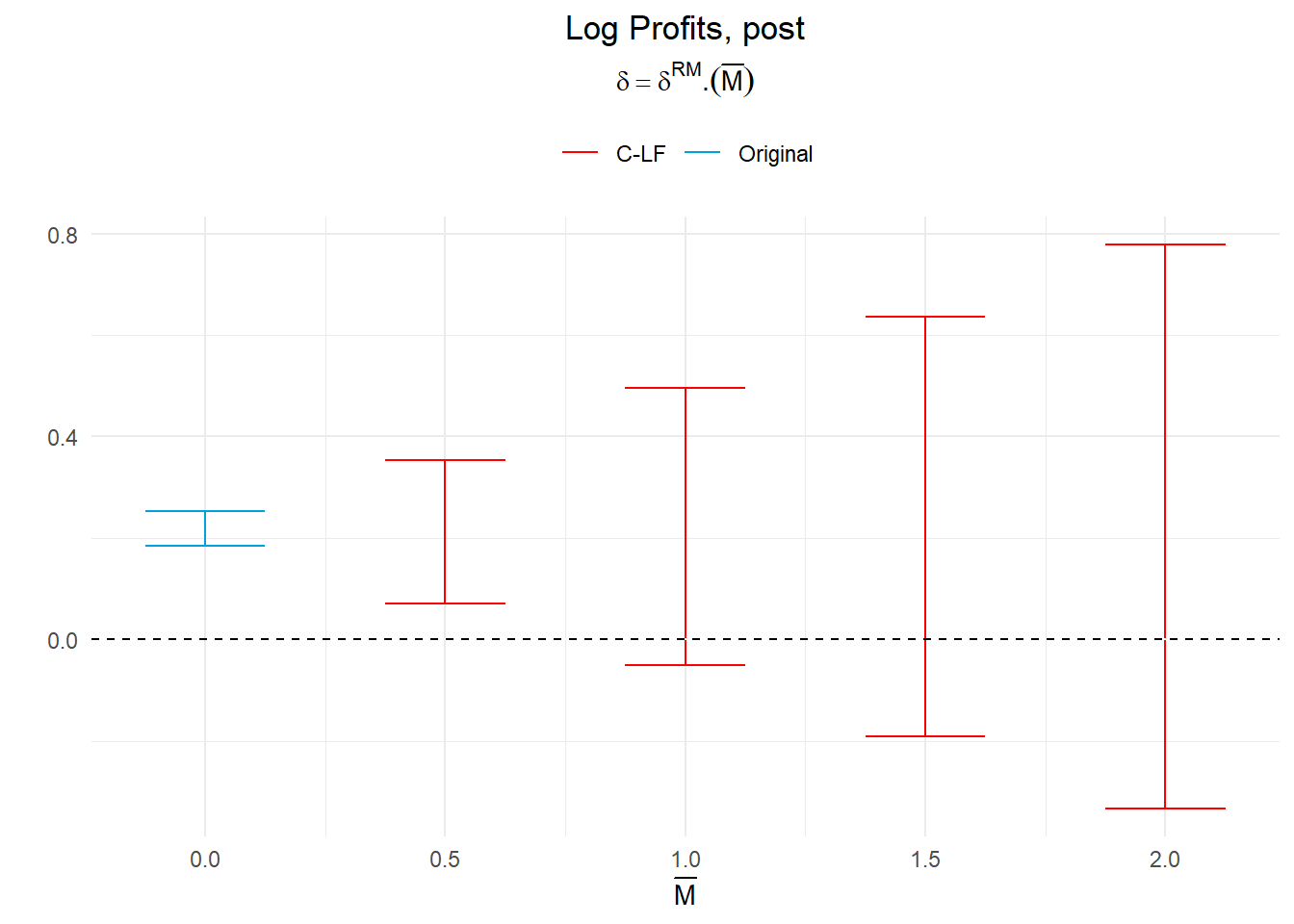 On voit bien que le résultat tiens jusqu’à la affectation d’une violation de la parallel trend sur la période post-traitement au regard de celle au maximum constatée sur la période pré-traitement (ˉM) de 2.