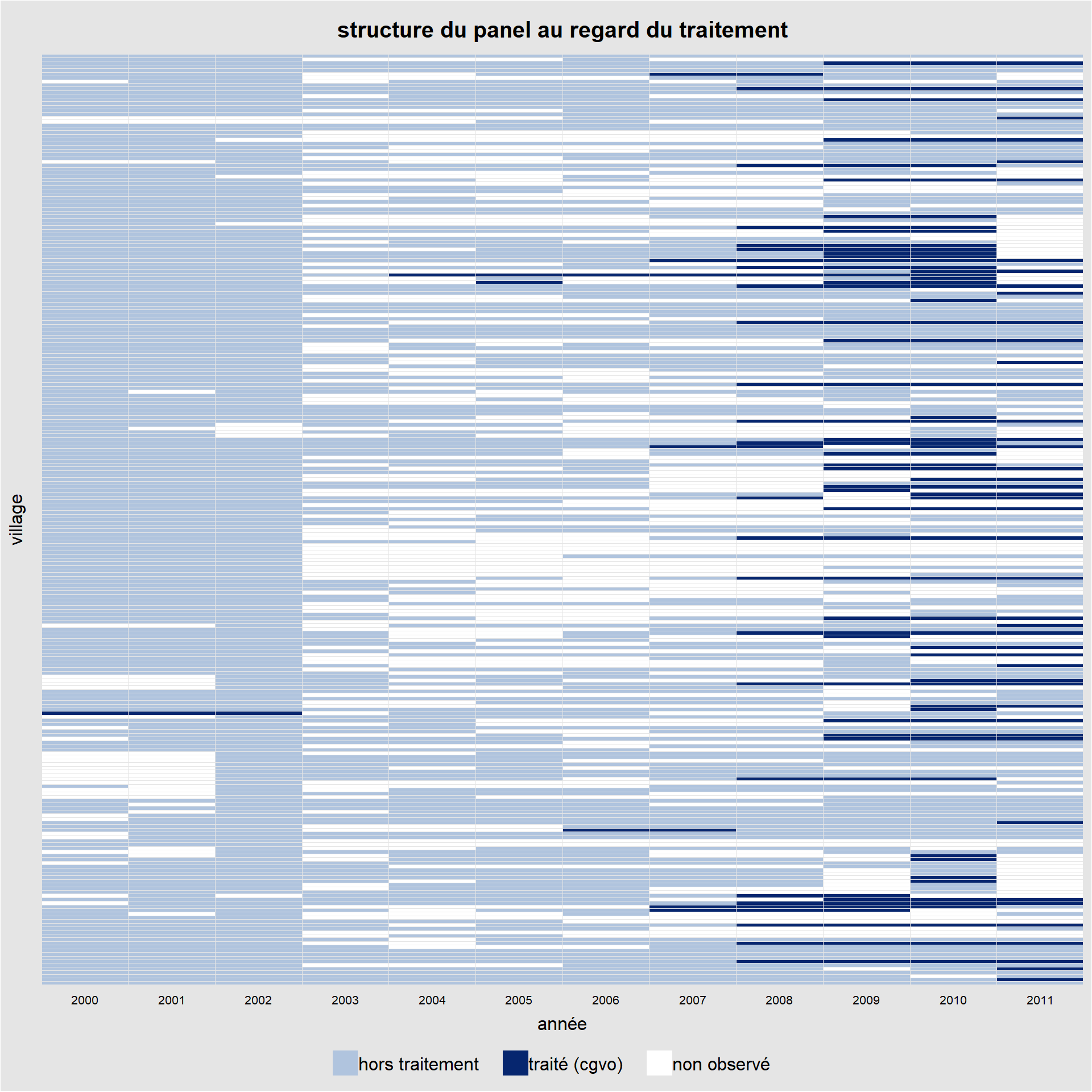 La lecture du graphe montre plusieurs choses. Tout d’abord, nous avons de nombreuses années pour lesquels nous n’avons pas d’observations. Ensuite, le traitement n’intervient qu’une fois par village, mais pas à la même date. De plus, la durée du traitement est également assez différente d’un village à l’autre. Enfin, il y a des villages qui voient leur statut de traité repassé à non traité après une période. Bref, on est loin d’un panel cylindré et d’un traitement homogène. Mais continuons. Comptons le nombre de villages traités et le nombre de villages qui ne le seront jamais sur la période d’étude (le groupe de contrôle).